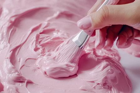 Close-up of a beauticians hands skillfully applying a creamy facial mask with a soft brush, showing smooth textures and soothing pastel tones.