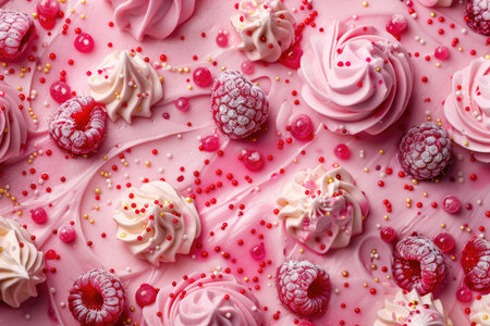 Pink whipped cream with sprinkles on a pink background, creating a playful and whimsical scene perfect for dessert or celebration themes.