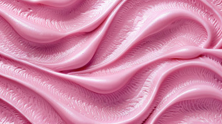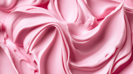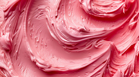 Pink icing frosting. close up texture ice cream. Pink creamy texture background with smooth and wavy patterns, suitable for cosmetics, food. soft and luxurious. Smooth pink buttercream frosting swirls and peaks close-up. background for bakery presentations, advertisements, and dessert