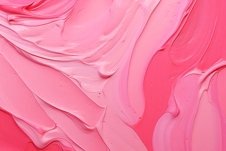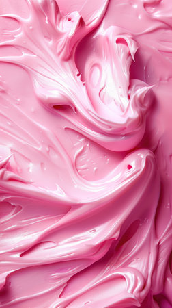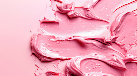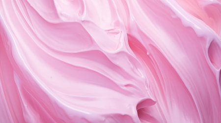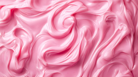 Swirls of thick pink paint creating a textured pattern. Cosmetic skincare smears cream backgrounds, dessert. Pink creamy texture and glossy appearance.