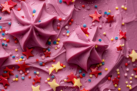 A pink frosting with sprinkles on top. The frosting is in a swirl pattern. Concept of fun and fun, as the sprinkles add a touch of whimsy to the frosting