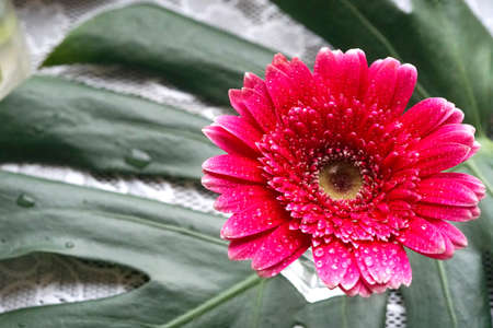 Pink Gerbera (Gerbera jamesonii) on green Monstera Deliciosa Leaf background.
