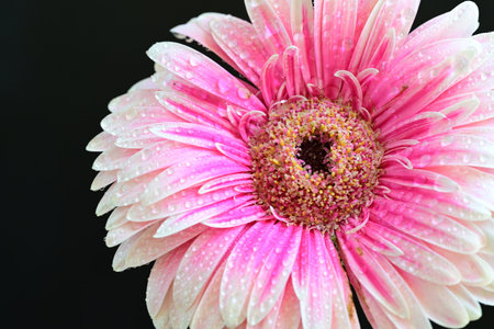 Pink gerbera flowerhead with black background and water droplets.
