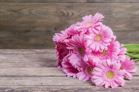 Pink and white gerbera flowers on wooden background with copy space