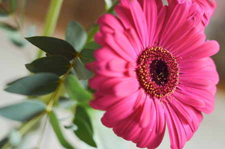 Pink gerbera flower with green leaves in the background, selective focus