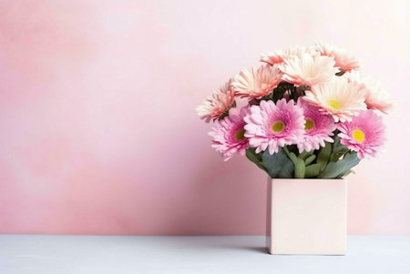 A close-up image of a bouquet of pink and white gerbera daisies in a white vase against a pink background. The flowers are in full bloom and the petals are soft and delicate.