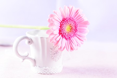 Beautiful summer pink chamomile chrysanthemum in the cup on ligh