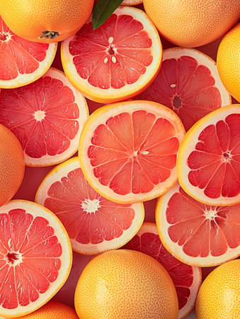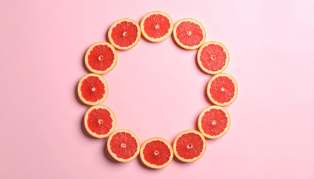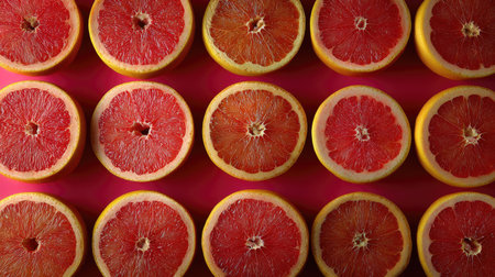 Vibrant display of freshly sliced grapefruits arranged symmetrically on a pink background. Ideal for promoting healthy eating, bright designs, or culinary projects.