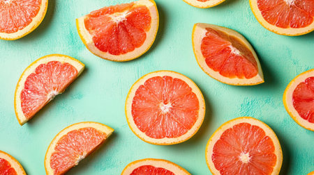 Fresh grapefruit slices arranged artistically on a mint green background. AI generated.