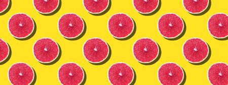 Grapefruit pattern on yellow background. Top view. Creative design, minimal flat lay concept. Summer time. Tropical travel, exotic fruit. Vegan and vegetarian food