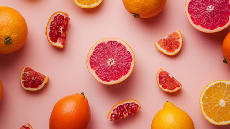 A colorful arrangement of citrus fruit slices, including oranges and grapefruits, displayed on a pastel pink background.