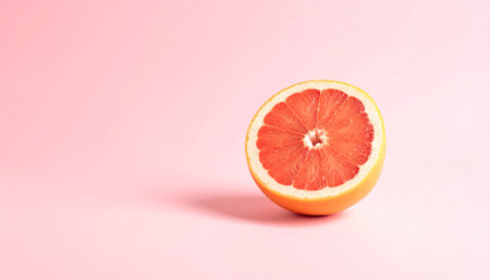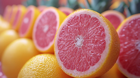 Fresh grapefruit halves bathed in sunlight, capturing the essence of a juicy, vibrant, and refreshing summer. These high-quality images bring a touch of nature zest to your design projects. Generated A.I.