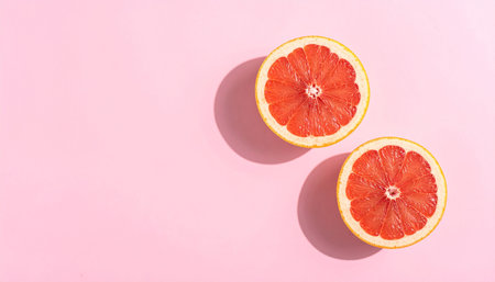 Grapefruit halves on pink background with natural light shadows.