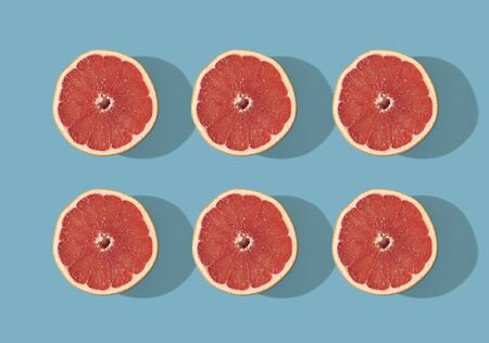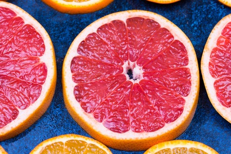 Bright red-orange grapefruit in a section on a blue background. Bright contrast photo. Pattern of grapefruit slices.