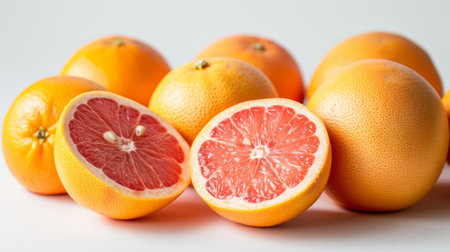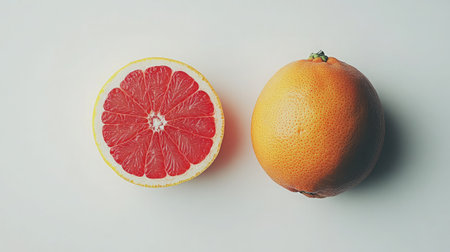 A vibrant composition featuring a fresh grapefruit cut in half beside a whole orange, symbolizing nutrition and healthy eating on a clean white background.