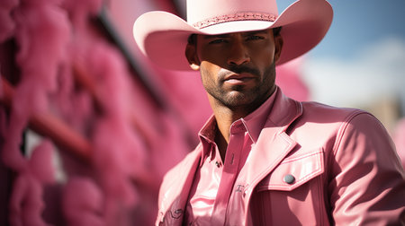 Man in a cowboy hat wearing pink clothes.