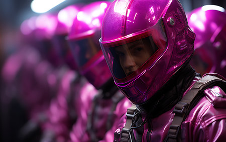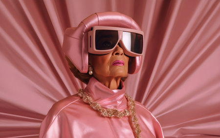 Portrait of a woman in a pink suit wearing virtual reality goggles, Generative AI