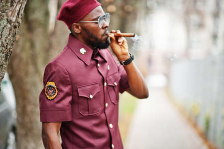 Portrait of African American military man in red uniform, sungalasses and beret. Captain smoke cigar.