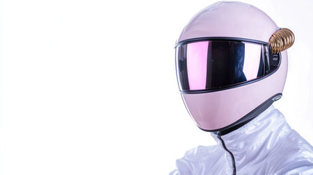 A detailed shot of a vibrant pink motorcycle helmet featuring a highly reflective, tinted visor. A tiny snail is perched on the side, adding an unexpected element to the protective gear.