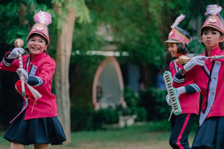 KANCHANABURI THAILAND - JULY 18 : Unidentified Drum major and parades are ready to athletic game opening on July 18,2018 at Nongthabong School in Kanchanaburi, Thailand