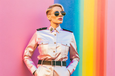 Disguised man, serious look, police officer with vibrant colors and clothing.