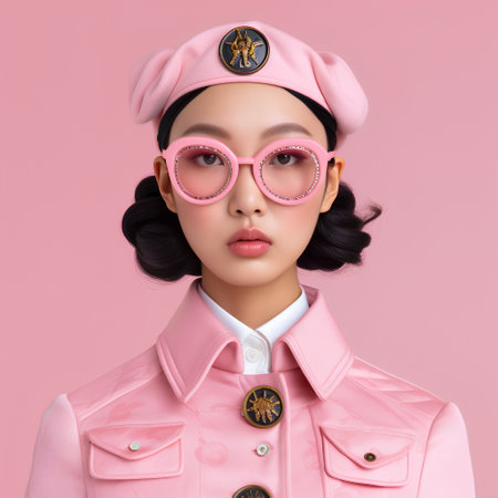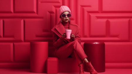 This striking image features two figures in vibrant pink knitwear and oversized sunglasses showcasing a blend of fashion art and a minimalist aesthetic.