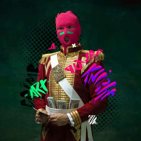 Contemporary art collage. Royal person, hussar in balaclava with money peeking out belt isolated over vintage green background