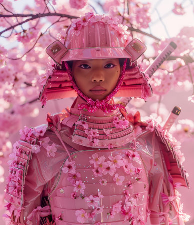 Black woman in pink samurai armor stands in a field of cherry blossoms