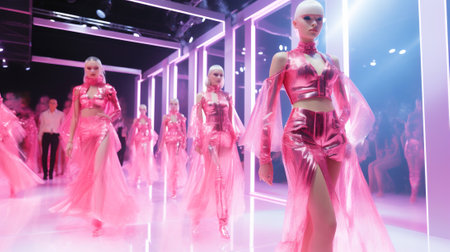 A group of stylish models in Barbie style pink holographic outfits strutting down a virtual catwalk amidst an ethereal digital fashion show. Banner. Generative Ai content