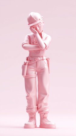 A pink construction worker is deep in thought, possibly planning or reviewing a project. The image is monochromatic.