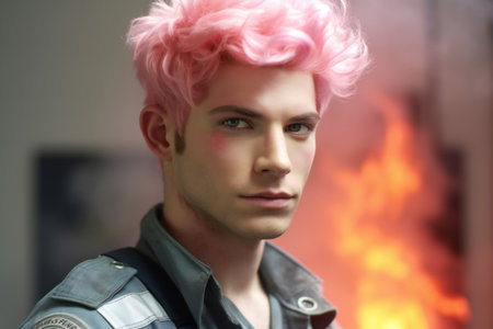 Young man with pink hair in police uniform standing in front of fire