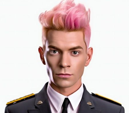 Portrait of a young man with pink hair in a police uniform