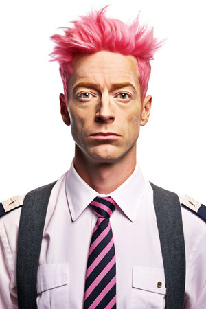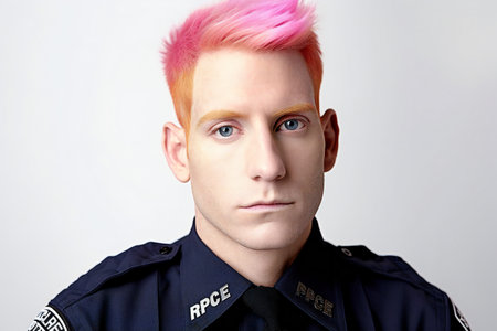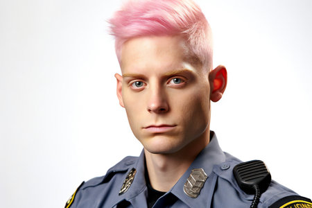 Portrait of young male police officer with pink hair and blue eyes