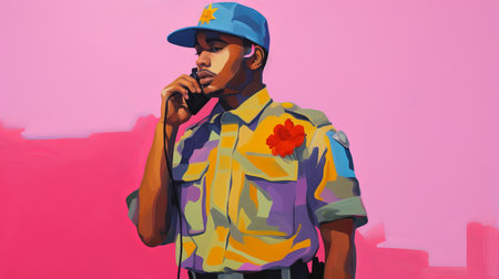 a man talking on the phone is depicted in this vibrant and colorful painting on a pink background. the artwork follows the style of scoutcore, featuring sharp focus and photorealist details. the uniformly staged image showcases the artist's use of vibrant colorism and incorporates elements of floralpunk. ai generated