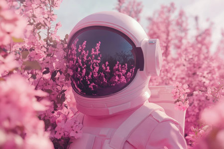 A whimsical astronaut in a vibrant pink flower field, blending elements of space exploration and nature, evoking feelings of wonder and tranquility