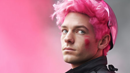 Portrait of a young man with pink hair on a pink background
