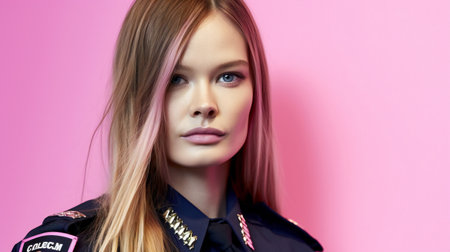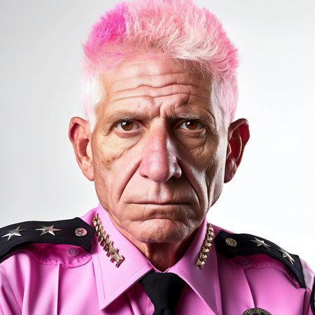 Portrait of a senior police officer with pink hair. Studio shot.