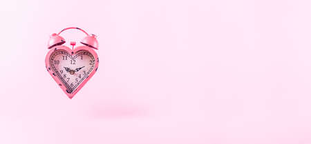 Heart shaped clock on pink background. Valentines day and love infitity and duration concept. Horizontal