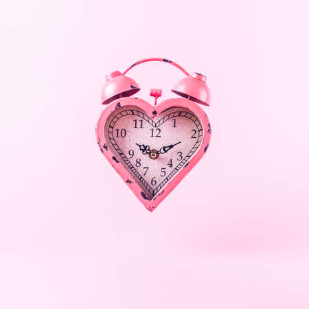 Heart shaped clock on pink background. Valentines day and love infitity and duration concept. Square