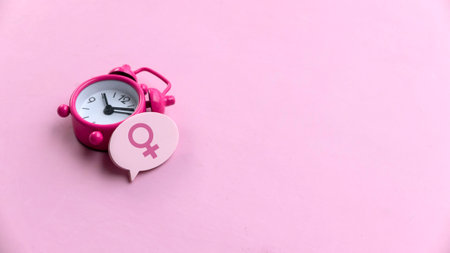 Menopause concept. Women symbol over a watch. Healthcare and medical for women. Pink background with copy space.