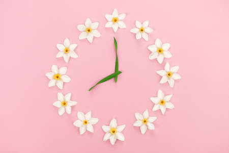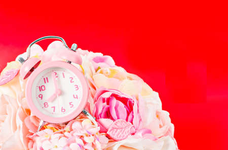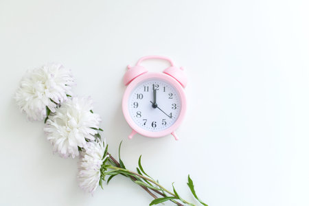 Top view or flat lay of white vintage alarm clock show 7 o clock with pink flowers decoration on pink background.