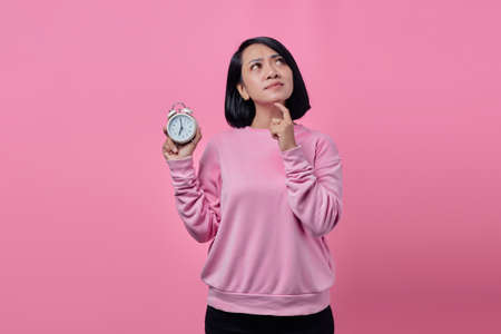 Portrait of plus size young lady smiling hands holds sand clock isolated on pink color background.