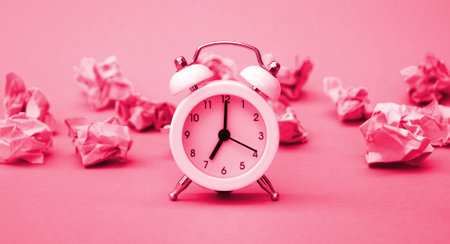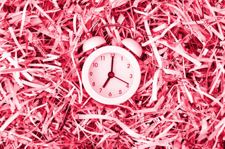 Vintage white alarm clock on a background of shredded paper. Image toned in Viva Magenta, color of the 2023 year