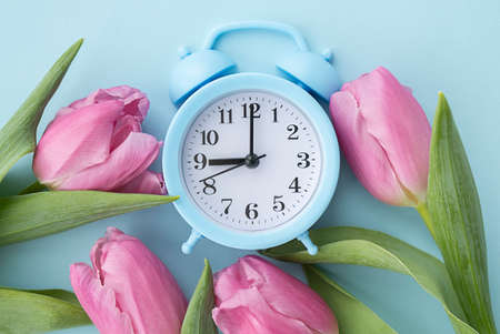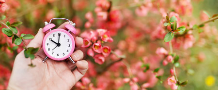 Hand holding an alarm clock in pink blooming easter flowers. Spring forward, springtime, daylight saving time banner.