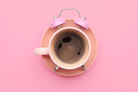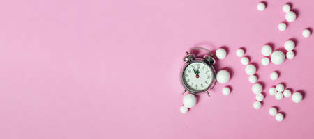 Banner with black alarm clock on pink background. Minimal style Top view Template for your text, design.