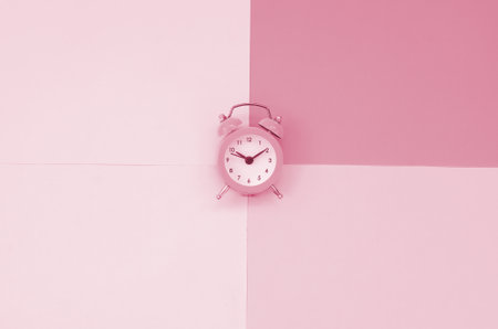 A small pink alarm clock is located between areas of different colors. The concept of time to choose. Flat lay minimal. Top view Image toned in Viva Magenta, color of the 2023 year