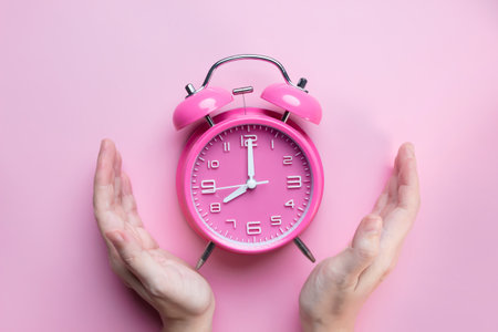 Woman hand protection pink alarm clock which set at eight o'clock, Start new business target, working hour, a time management concept.