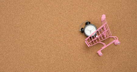 pink shopping cart and black round alarm clock inside on brown background. Time is money, banner