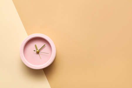 Alarm clock pointing at 2 am or pm with customizable space for text or ideas. Copy space with pink background.