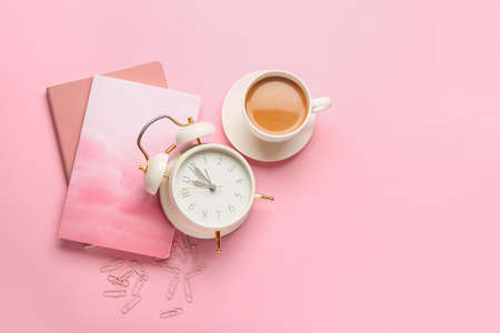 Vintage alarm clock on pink background. Retro modern watches. High quality photo